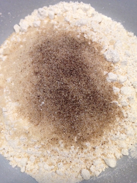 - mit einem Schneebesen gut verühren, dann die restlichen trockenen Zutaten zugeben (Prise Salz, Natron, Stärke und das Backpulver) ebenso alles gut verrühren