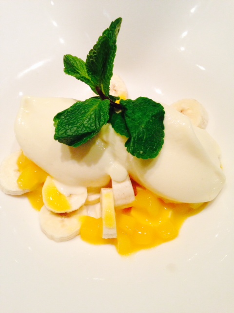 Vorspeise: Pilzvariation auf Wildkräutersalat; Zwischengang: Tomatensuppe; 2. Zwischengang: Salat vom Buffet; Hauptspeise: Ebly mit Gemüse, Tomatensauce und Ruccola; Nachspeise: Mangoeis mit Bananenstücken und leckerer Mangosoße