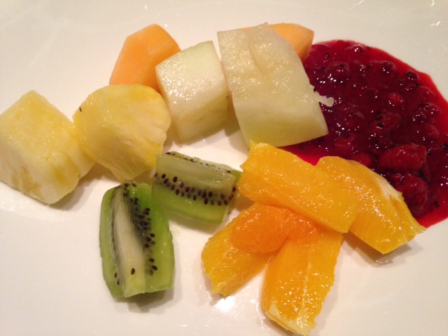 Vorspeise: Gemüse-Carpaccio; Suppe: Wildkräutersuppe; Zwischengang: Salat vom Buffet; Hauptspeise: ich habs vergessen und da mein Freund schon wieder beruflich verreisen musste (diesmal Schanghai) kann ich ihn gerade auch nicht fragen 😦 ; Nachspeise: Obst vom Buffet