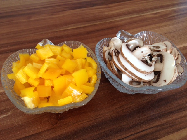 - Zwiebel würfeln und Knoblauch schälen für Knoblauchpresse (oder fein würfeln), getrocknete Tomaten ebenso fein Würfeln, Champignons in dünne Scheiben schneiden und Paprika in grobe Würfel schneiden