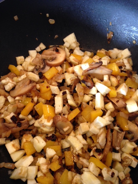 - 1 EL Olivenöl in eine Pfanne geben und die Zwiebelwürfel dazu, alles erhitzen, Pilze dazugeben und scharf anbraten, danach Paprikawürfel, Knoblauch und die getrockneten Tomaten dazugeben und auf mittlere Hitze andünsten