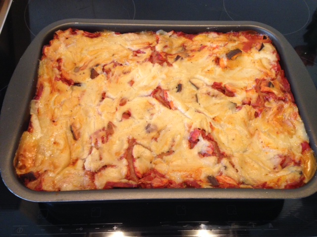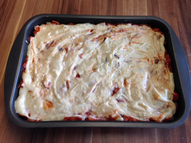 - Beide Saucen vom Herd nehmen und die Auflaufform zu Hand nehmen. Nun abwechselnd schichten: Sauce, Béchamel, Dinkelblätter usw. (ich wiederhole dies 2 mal), der Schluss bildet natürlich die Tomatensauce und die restliche Bechamelsauce