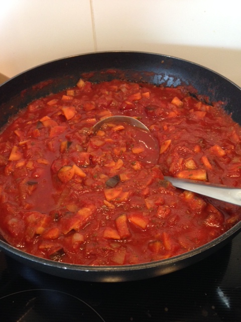 - Karotten und Aubergine zugeben wenn der Rotwein verdunstet ist und das ganze kurz anbraten