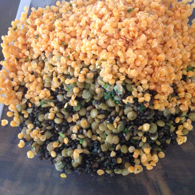 2. die Linsen kochen (je in einem eigenen Topf), die schwarzen Linsen haben wir in Suppenbrühe gekocht mit einem Esslöffel geschnittenem Petersilie, die grünen Linsen ebenso in Suppenbrühe und die roten in Wasser