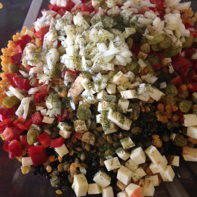 5. Die gekochten Linsen in eine Schüssel, die restlichen Zutaten + ein Teelöffel Dill dazugeben, Dressing drüber und ordentlich umrühren. Nach Belieben noch mit Salz und Pfeffer abschmecken (viel benötigt ihr nicht da die Linsen schon einen ordentlichen Geschmack haben durch die Suppenbrühe)