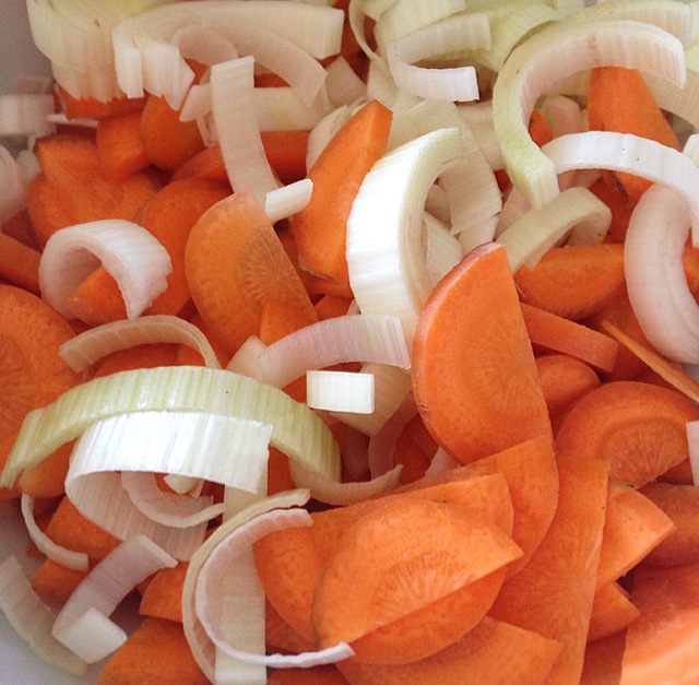 - Champignons, Karotte und Lauch in dünne Scheiben schneiden, die Zwiebel in kleine Würfel und den Knoblauch wenn ihr ihn nicht durch die Koblauchpresse drückt ebenso in kleine Würfel schneiden